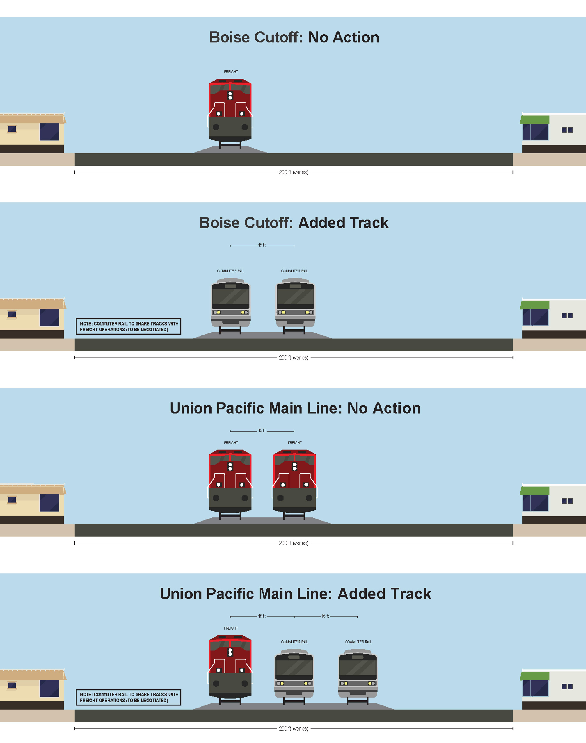 This route is referred to as the Boise Cutoff for simplicity; however, the Boise Cutoff (or Boise Valley Railroad - Watco Railroads) portion of the route only extends from approximately the Boise Depot to the where the rail curves near downtown Nampa. From downtown Nampa to Caldwell, the rail corridor is part of the Union Pacific Railroad's Huntington Subdivision.