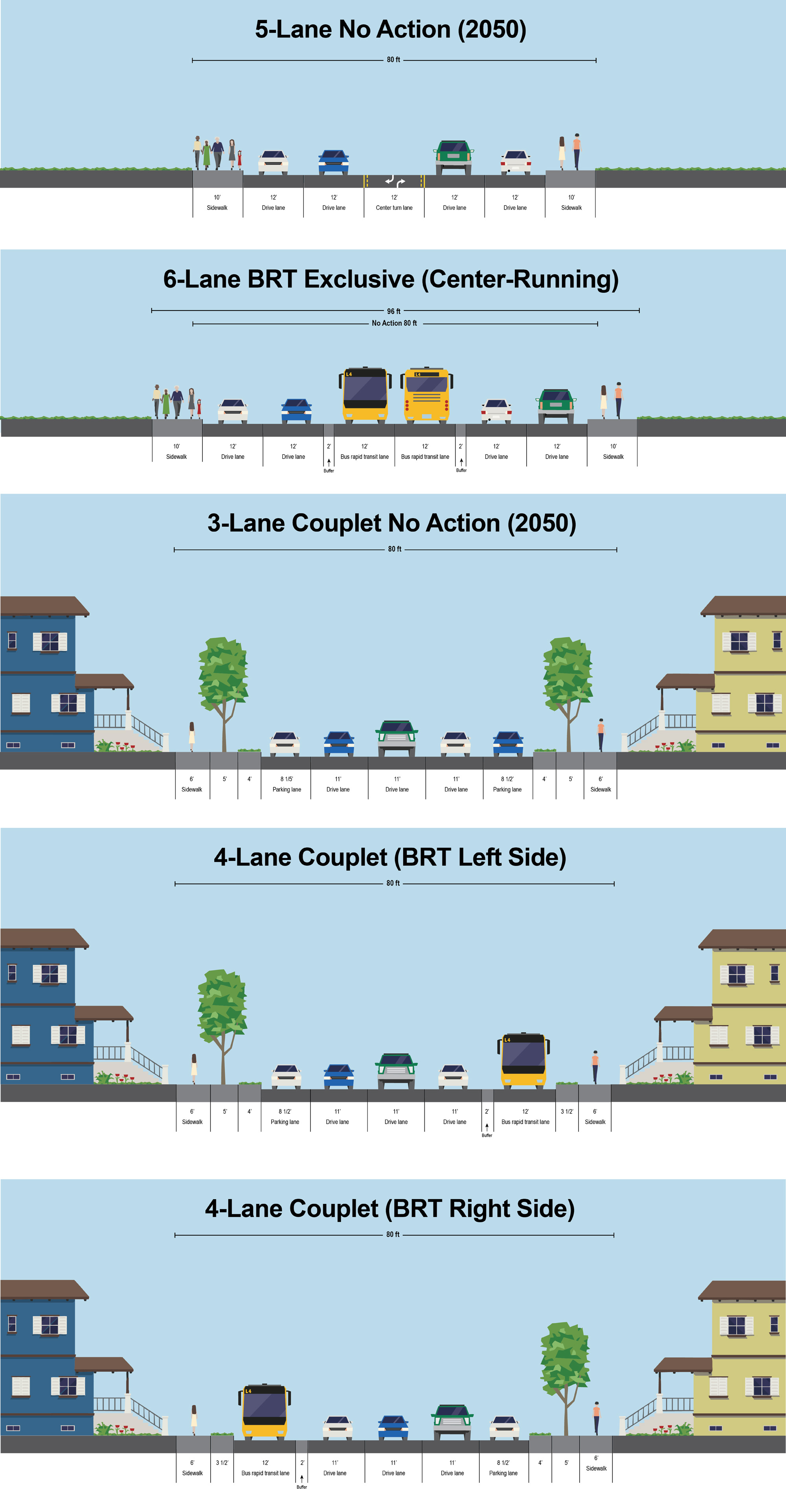 Click on the options below to view the route options and tentative station locations that were carried forward. Note: The following cross sections show representations of the corridors with and without the transit route in 2050. Multiple cross sections are shown for each corridor to demonstrate what each corridor could look like in different sections with different characteristics (e.g., different numbers of vehicle lanes).